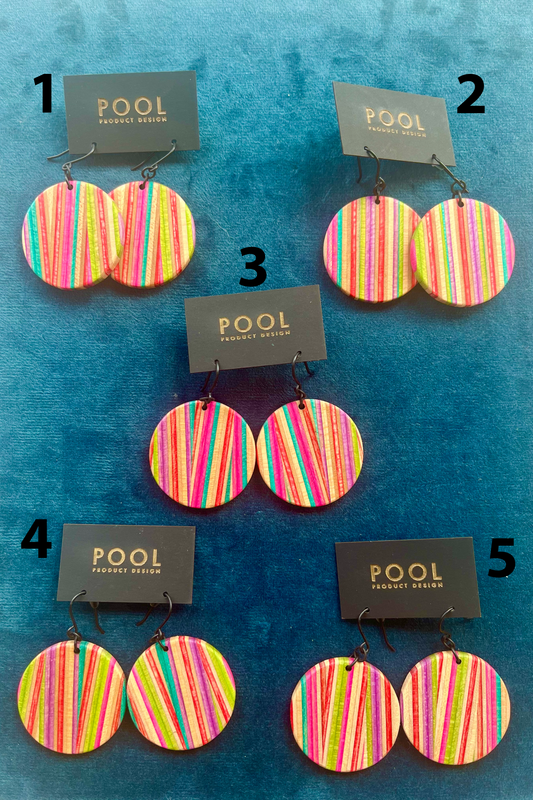 Pier dangle earrings made from repurposed skateboards