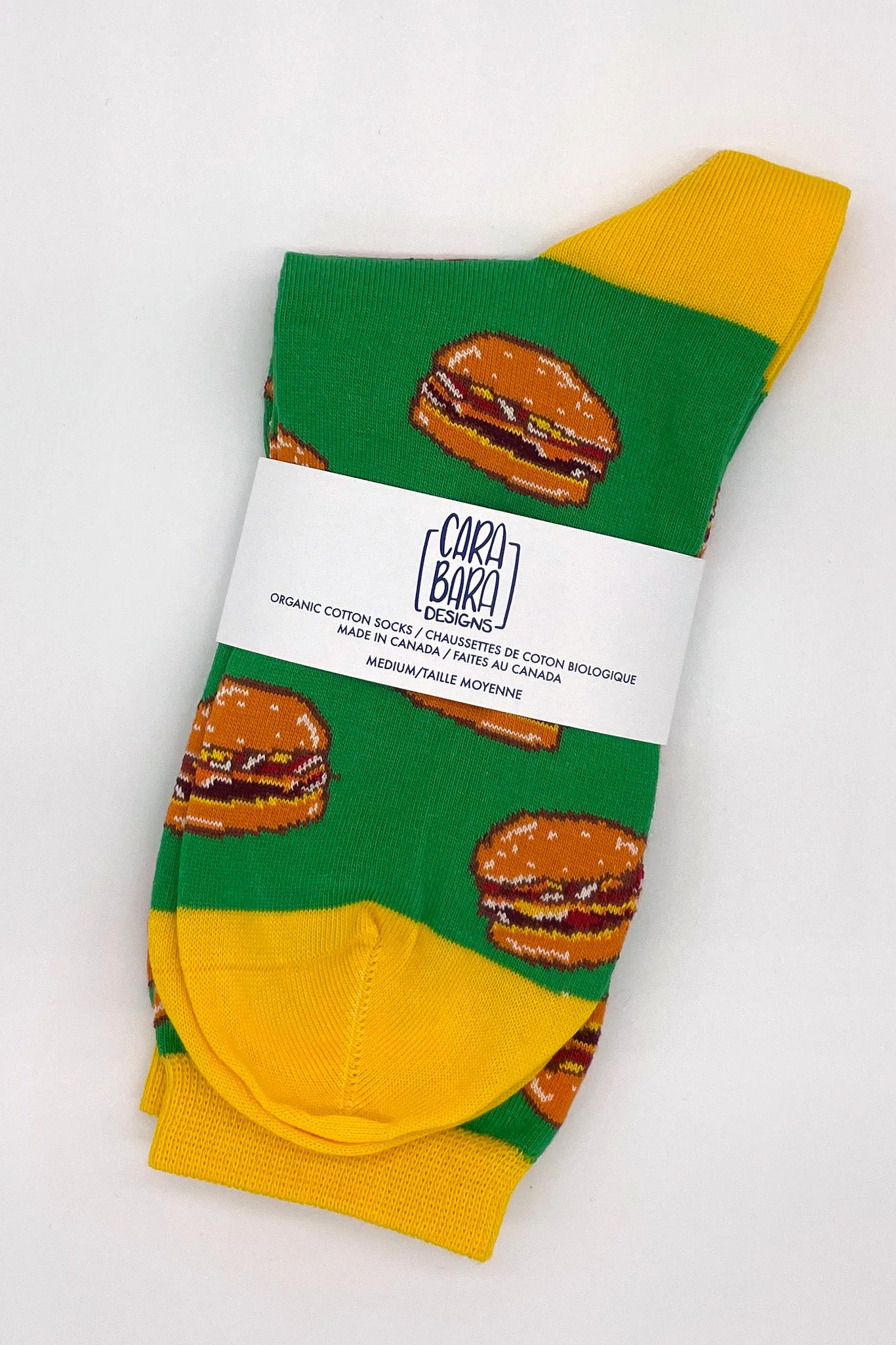 Choose fun socks! A juicy cheeseburger on green will add panache to a delicious outfit.