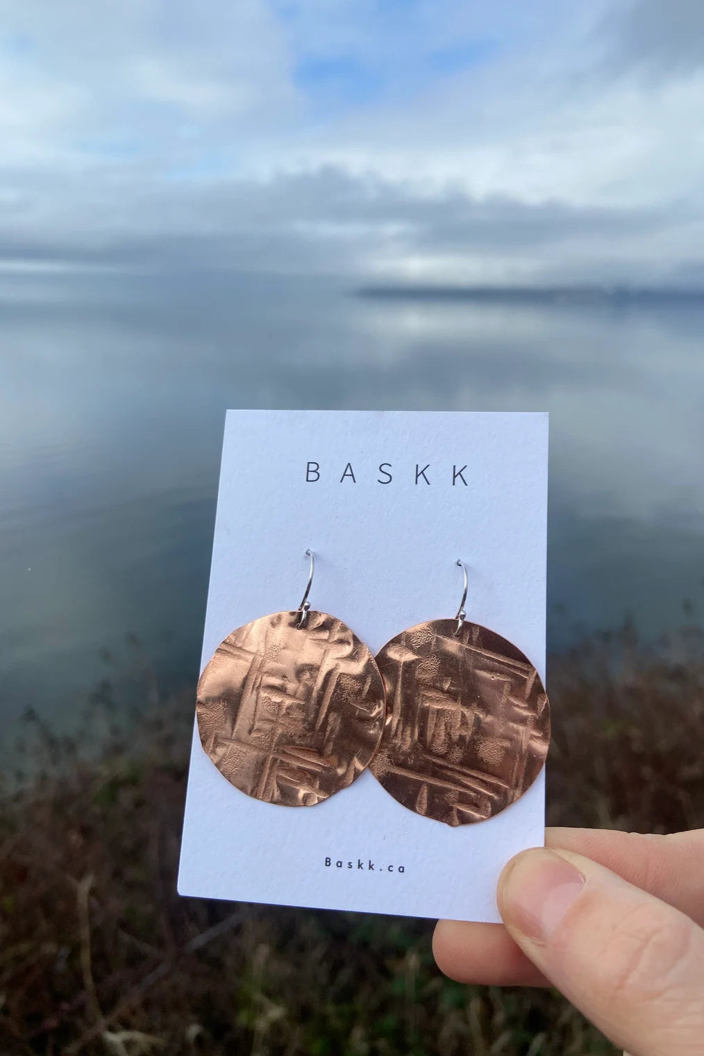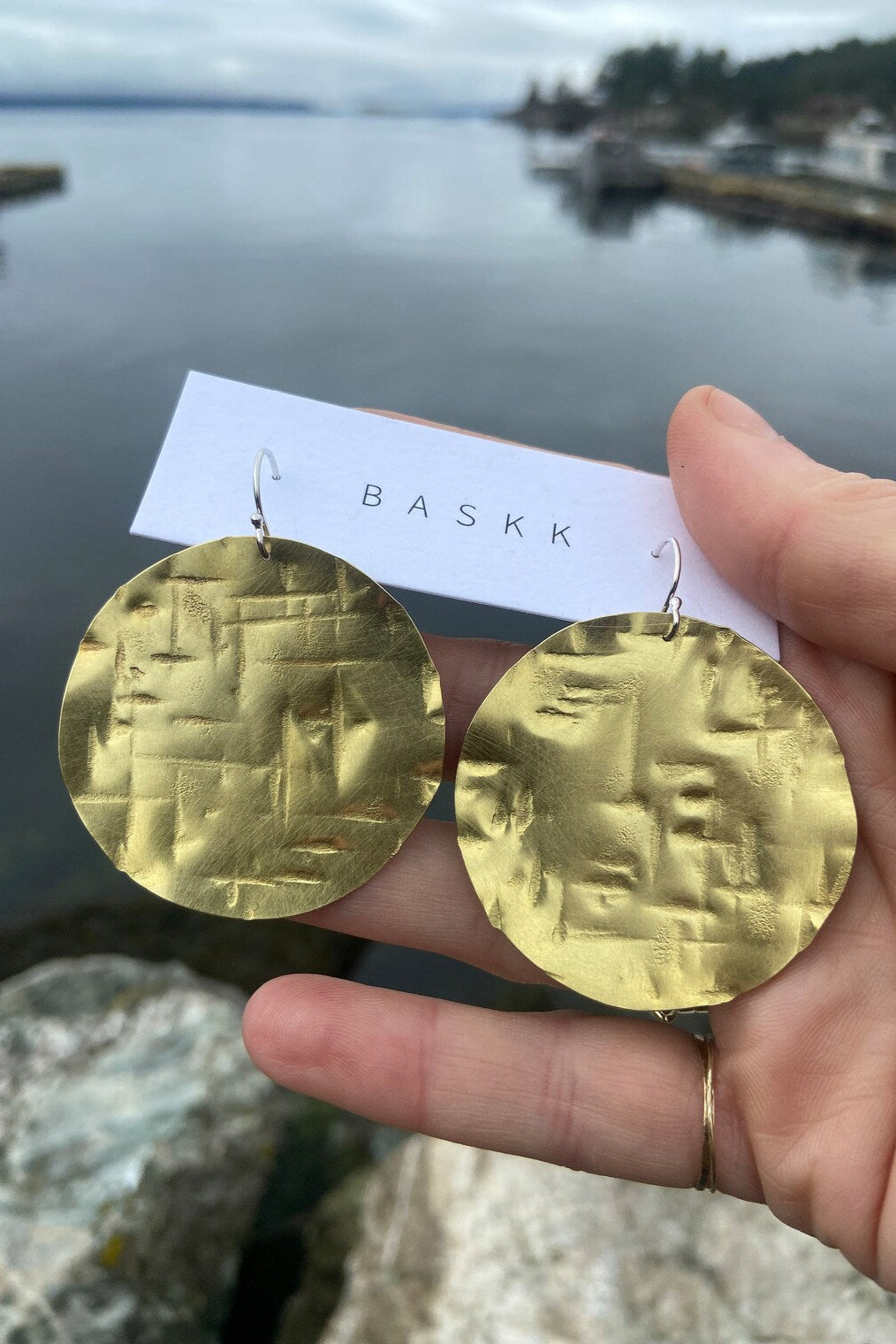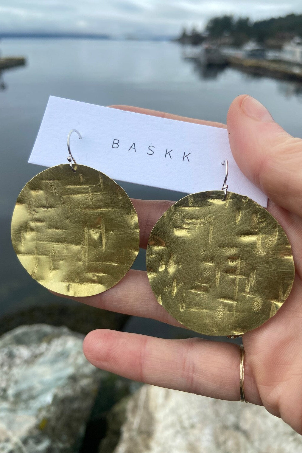Hand made super light weight brass, copper, or sterling earrings. Hand hammered cross hatched texture with sterling silver ear hooks. Super light weight and easy to wear.