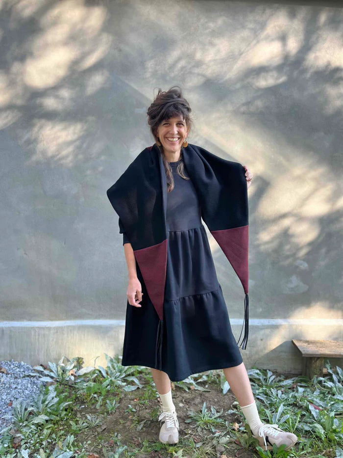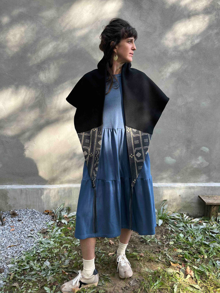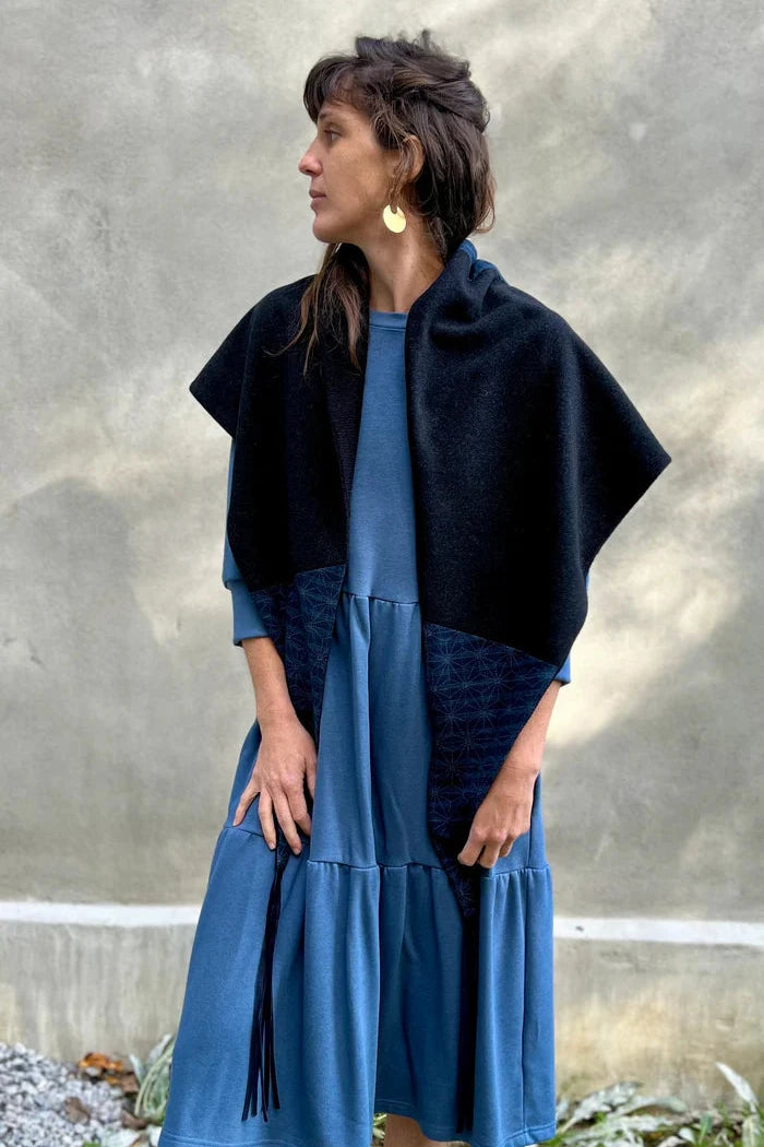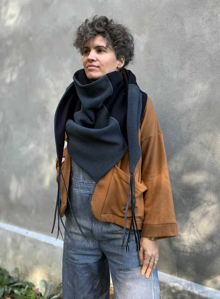 Wool scarf / shawl with a soft rib pashmina knit interior and recycled leather fringe.