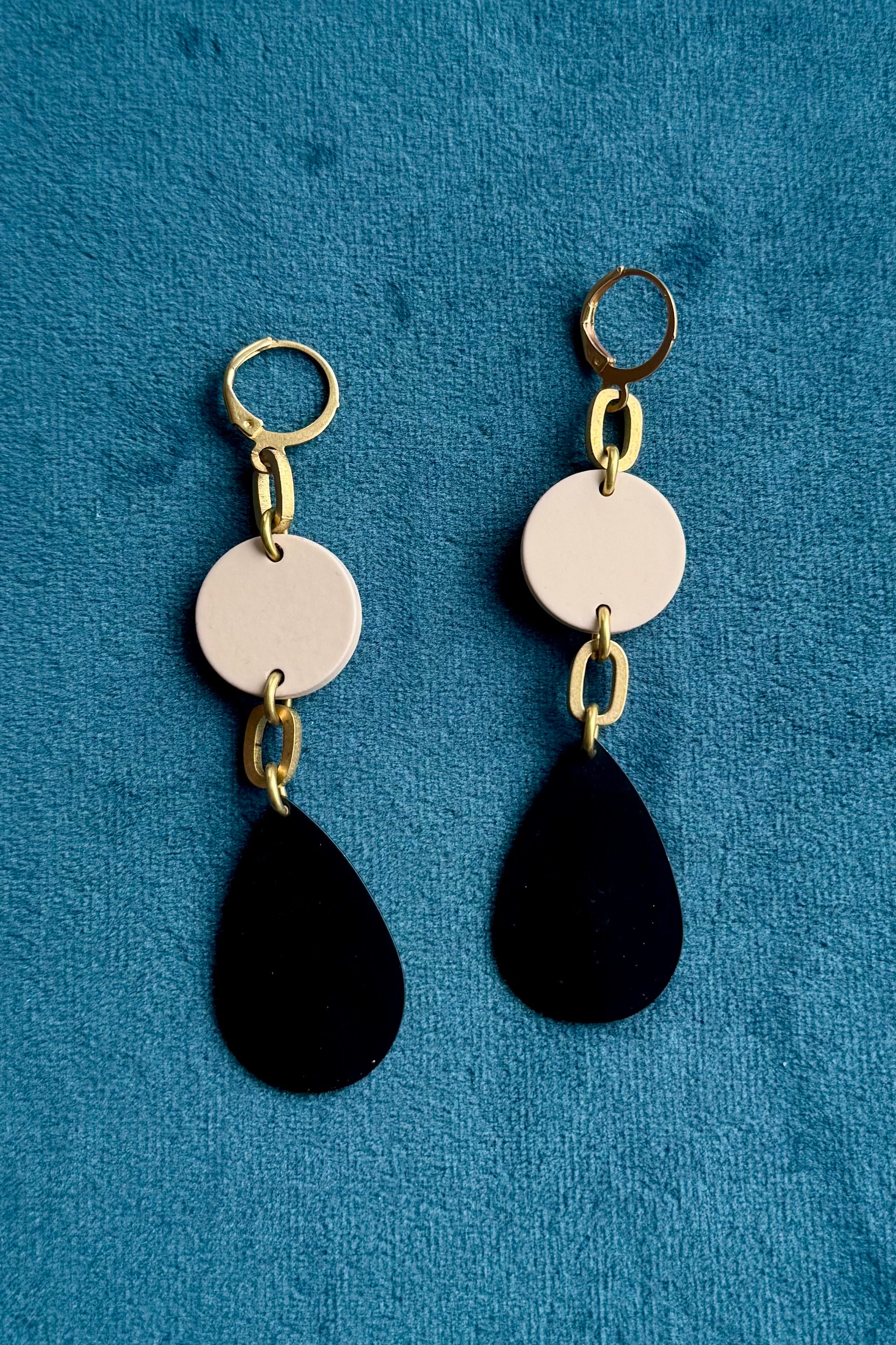 Brass, acrylic and powder coated metal earrings with gold plated brass huggie hoops. Handmade in Ottawa.