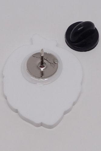 Pin made from reclaimed white plastic, engraved and laser cut. Green paint filling.