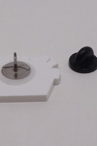 Pin made from reclaimed white plastic, engraved and laser cut. Brown and yellow paint fill.