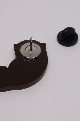 Pin made from reclaimed dark brown plastic, laser engraved and cut. Grey paint fill.