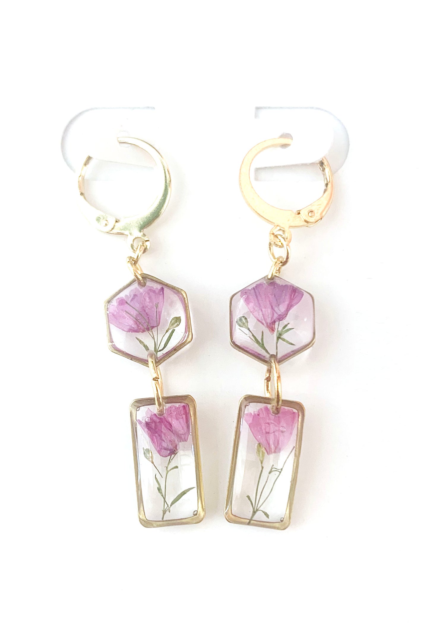 Real pressed flowers and leaves preserved in resin. Hung on gold plated stainless steel lever backs.