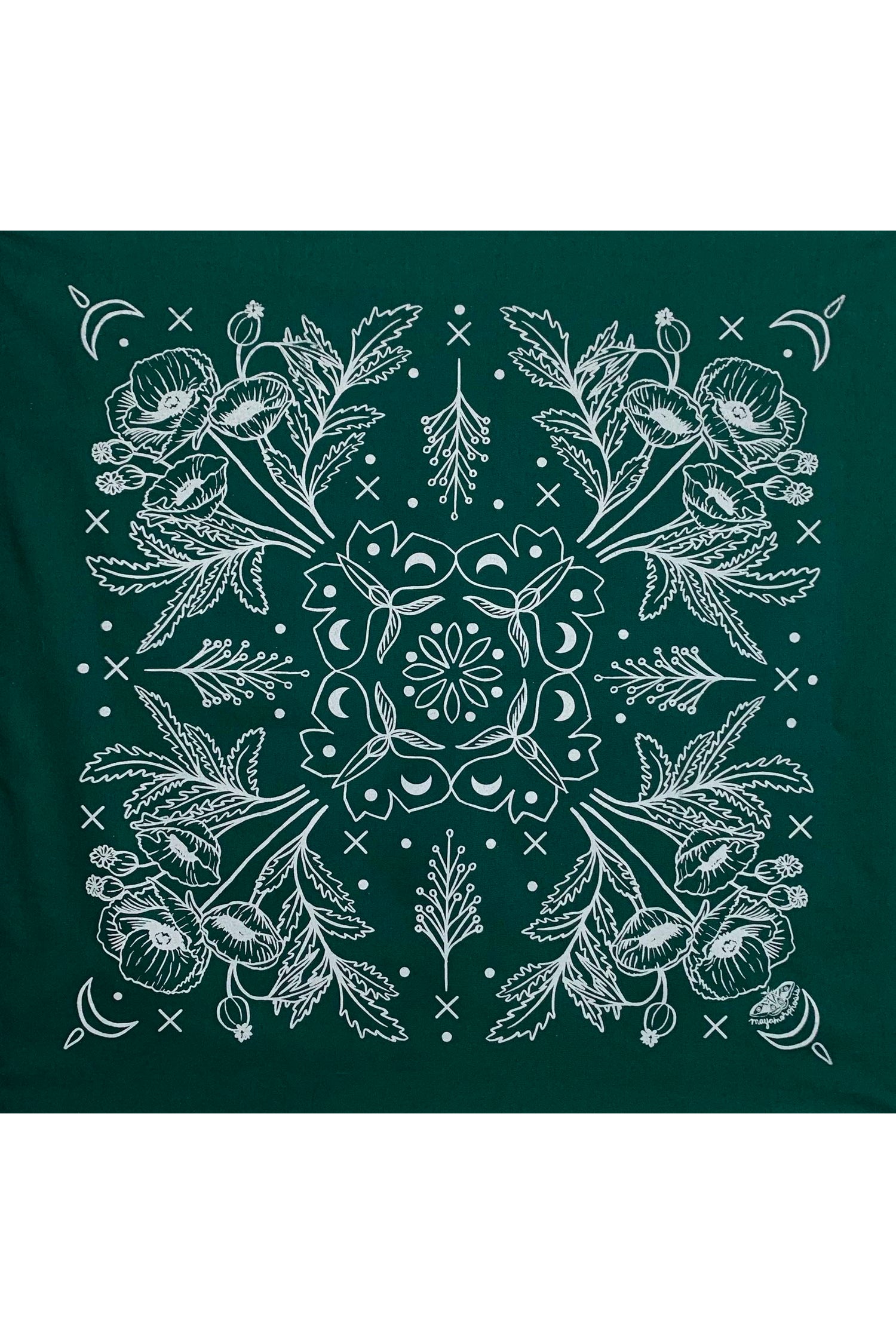 Moths evoke transformation and change because of the incredible life cycles they go through, from caterpillar to chrysalis to beautiful winged insect. Poppies are associated with peace, sleep and healing due to their natural sedative properties. The moon is tied to our own cycles of energy and emotion, for its ability to move water and create tides.