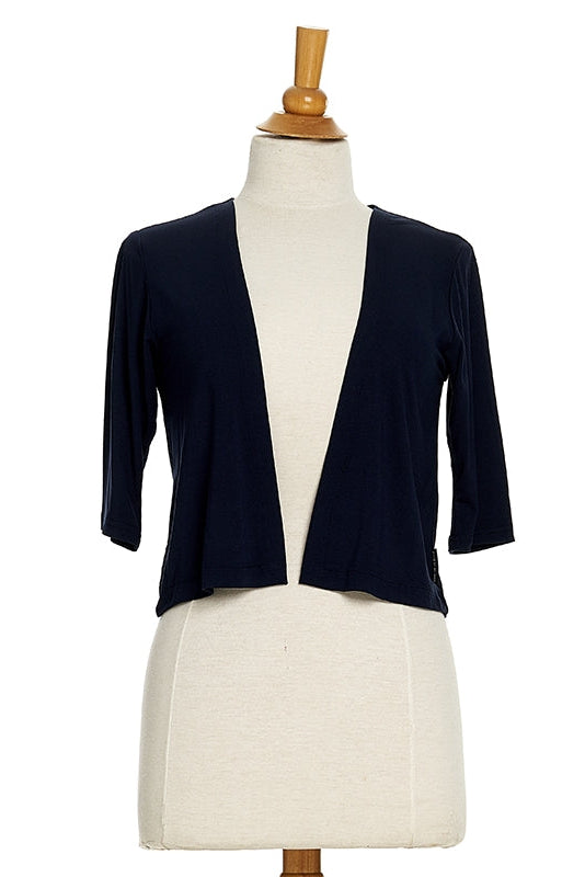 This super soft Rayon bolero can be worn with pretty much anything! Ultra versatile, it has elbow-length sleeves and slightly angled front panels. It comes in Black, Navy or White in sizes XS to XXL.