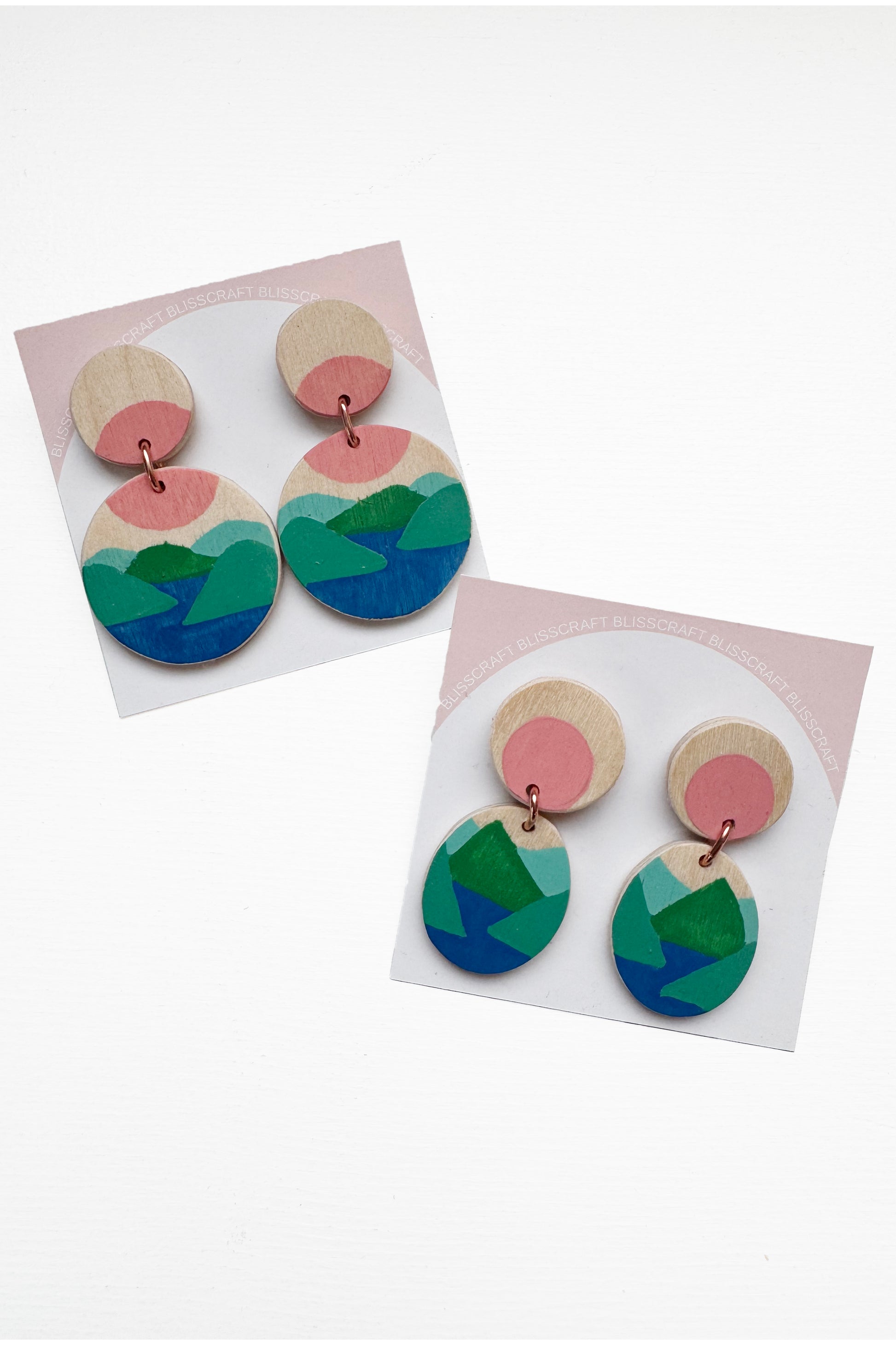 These one-of-a-kind Vista Pink Moon earrings are hand-painted on birch wood, and are extremely light and easy to wear. The sterling silver ear posts are seated in leather cushioning for extra comfort and security, with sterling silver butterfly backings.