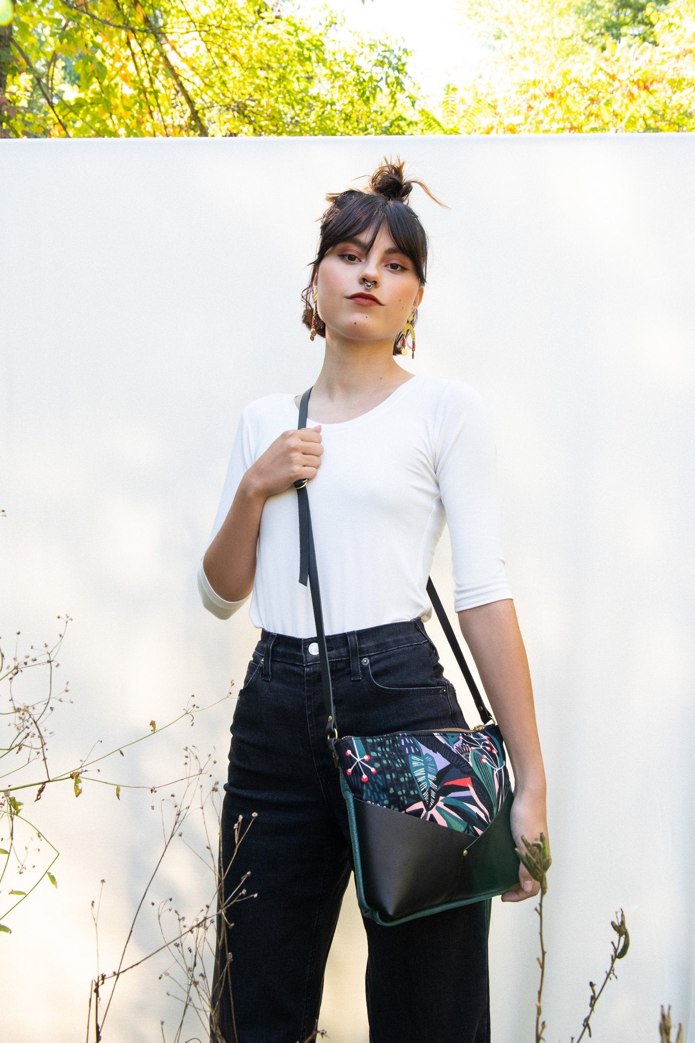 The Woodstock Recycled Leather Shoulder Bag from Kazak is a small satchel that can be worn over the shoulder. Each piece is made of recycled, vegetable-tanned leather. Some colours feature contrasting canvas fabric. The pouch closes with a zipper and has a separator in the lining. The strap is adjustable. Available in several colours and prints.